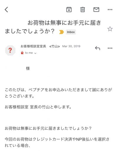 購入後は定期的にメールを送ってくれる。実感するために必要なことなどを教えてくれるのでかなり親切な感じ。
