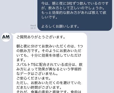 スパルトT5の飲み方を質問してみた。20分程度で返信アリ。かなり丁寧な印象で実際の人が内容を見て返事をくれている様子。スパルトT5に関係のない性の悩みもかなり真剣に回答してくれた。